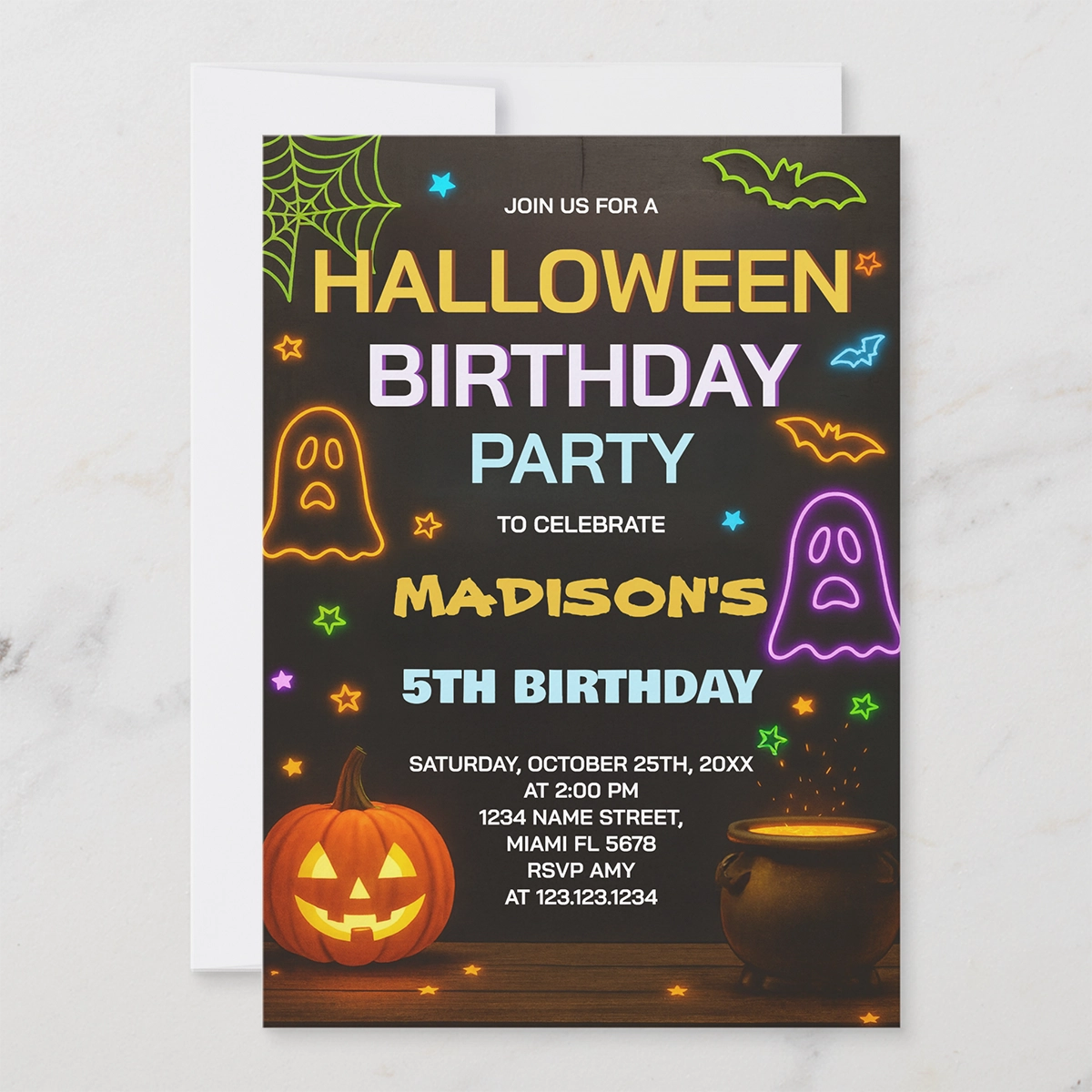 Throw a spooktacular birthday party your child will never forget with this Halloween Birthday Invitation! Featuring playful ghosts, pumpkins, bats, and festive fall accents, this design is perfect for kids of any age who love the magic of Halloween. Whether you’re planning a Boo Bash for a 5th birthday, a spooky sweet 7th birthday, or a Halloween-themed teen party, this customizable invitation makes it easy to share the fun. Add your child’s details, party time, and location for a one-of-a-kind invitation that sets the tone for a boo-tiful celebration! Great for: Kids’ Halloween Birthday Parties 🎂 Spooky Cute Boo Bash 🎃 All-Ages Halloween Celebrations 👻